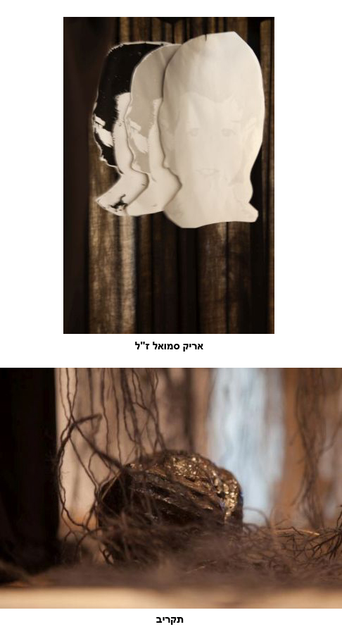 מהדופן העליונה של הקוביה הלבנה תלויים חוטי יוטה באורכים שונים שיוצרים סבך. חלק מהחוטים צבועים באפור. צבע האפר. גופי ברזל חלולים תלויים מחוטים. הם תזכורת לכאב שמתעצם בכל אירוע בו מת ילד אחר. בתוך הקוביה מבד שחור תלויות תמונות של אריק, הבן עליו אני מתאבלת. התמונות דוהות כמו שהזיכרון דוהה.