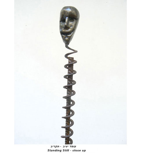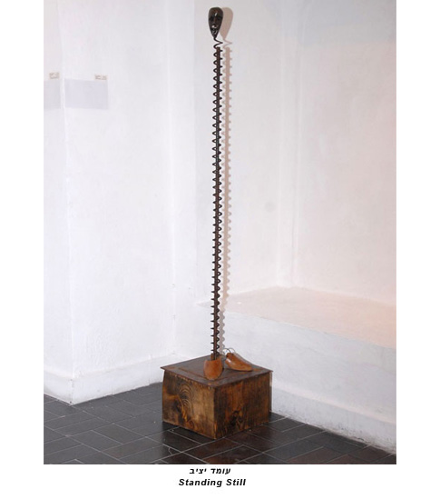 To touch, to feel and to connect to different materials with closed eyes and seeing with our imagination. Human dummies inspired me to build a character. An encounter between the hot and smooth material – wood, and the cold winding metal – iron. To the spring made of rusty metal waste, which Ruth found while wandering in the fields, and the wooden dummies purchased at the flea market, which were shoemakers' tools, Ruth Agmon added a cast head, fruit of her work. This combination created the image of the standing man.