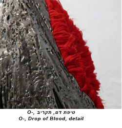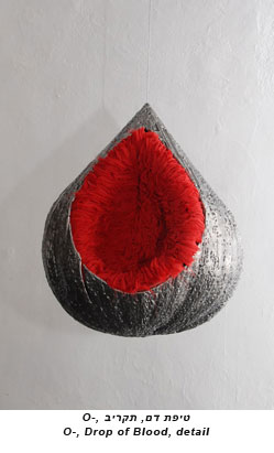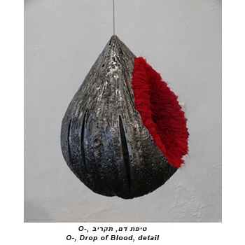 The drop, hanging from the ceiling, consists of two parts made of very different materials: fabric and iron. The combination of these materials creates a body that intrigues the eye and the touch as well. The outside is a hollow iron body of cold and hard material, and the inside is a soft and warm red fabric coating. The artist has great interest in creating interesting textures with the aim to stimulate the eye - the seeing as well as the hand – the touch.