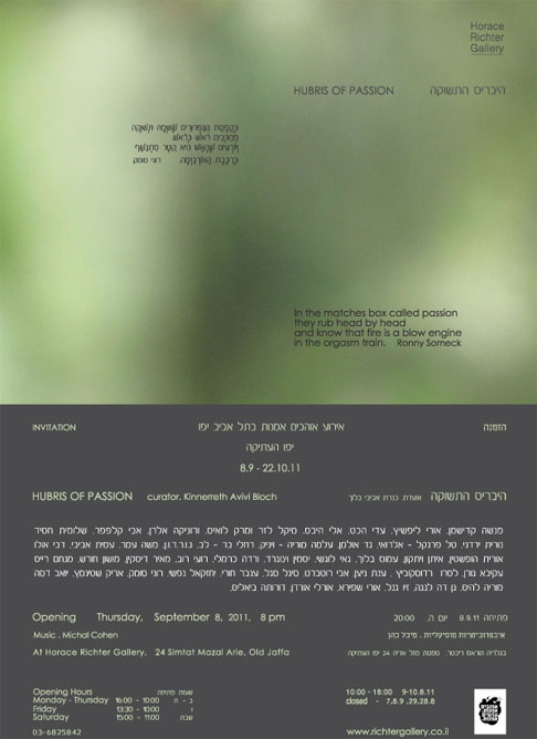 ביום חמישי בשעה 20.00 תפתח התערוכה "היבריס התשוקה" בגלריה הורס ריכטר ביפו העתיקה. בתערוכה מוצגת היצירה האחרונה שלי: "ארוס". "ארוס, ארוס לי תחנה אהבה לא אשיגנה".